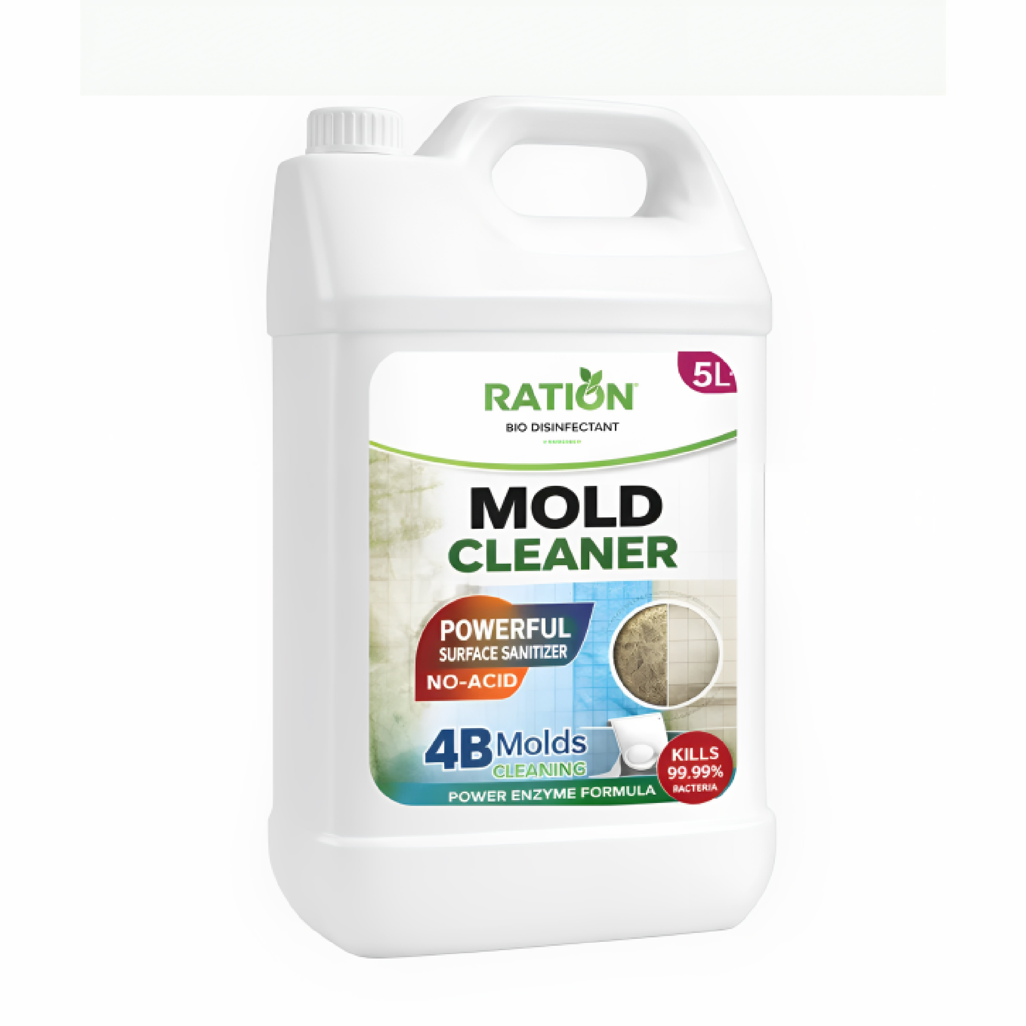 Ration Bio Disinfectant Mold Cleaner (Can Pack) is a powerful, enzyme-based surface sanitizing solution specially formulated to remove and control mold growth effectively. Powered by an advanced power enzyme formula, this no-acid cleaner penetrates deep into mold-affected surfaces to eliminate stubborn mold stains while ensuring safe and hygienic cleaning.